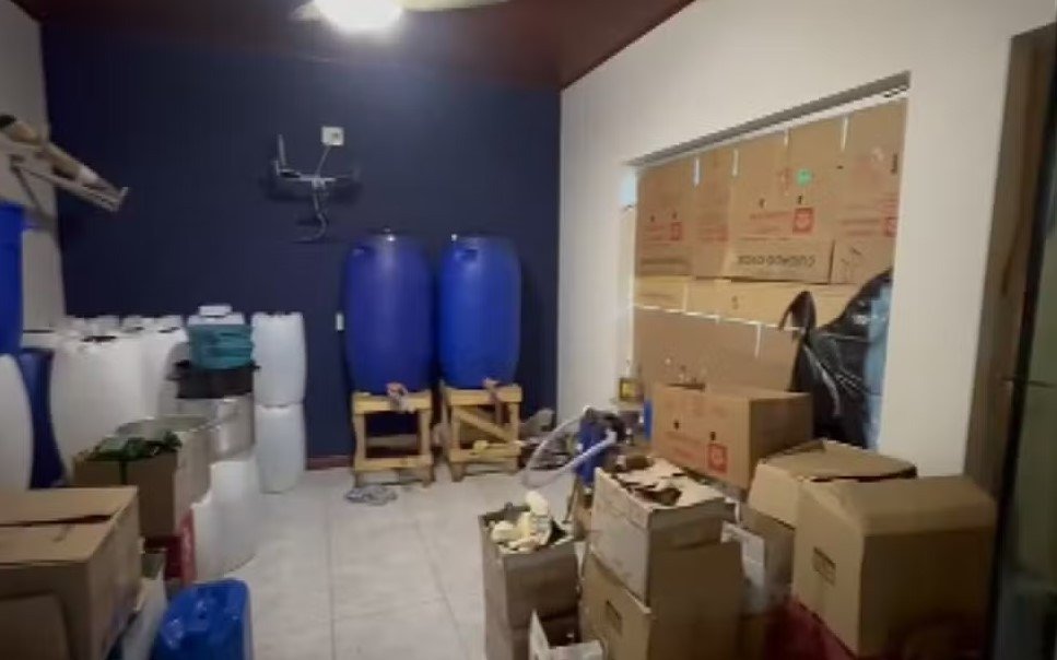 Nas imagens registradas pela polícia, é possível ver dezenas de garrafas que foram produzidas no local, com direito a rótulos, embalagens e tampas de uma marca conhecida no mercado.