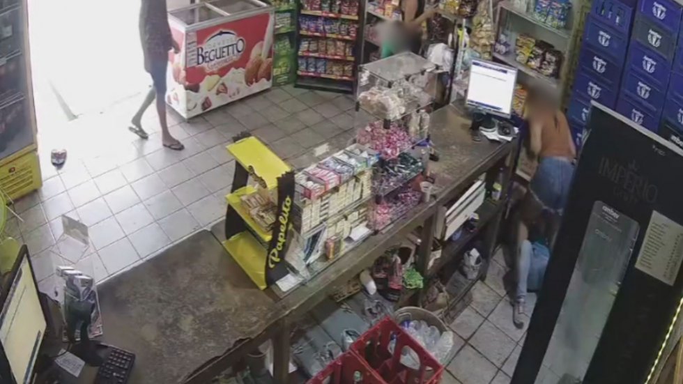 No vídeo, é possível ver o momento em que a suspeita entra no estabelecimento e vai até uma das geladeiras. A vítima está de costas quando é surpreendida por um puxão de cabelo e cai no chão (assista acima).