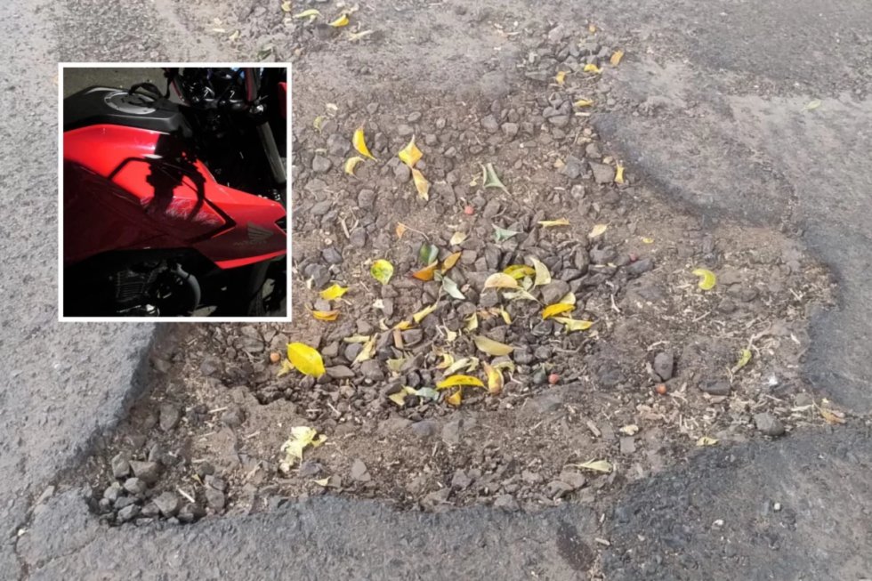 Buraco no asfalto derruba motoentregador de 19 anos durante entrega no Quitandinha: ‘Situação complicada’